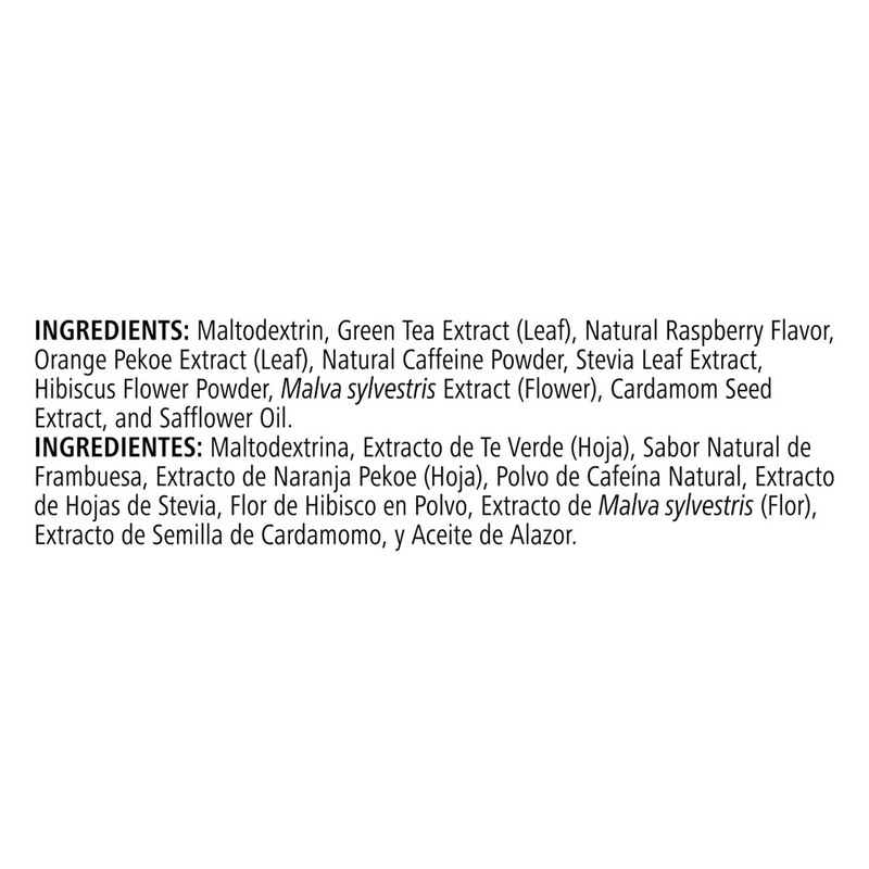 Green tea extract, orange pekoe extract, caffeine, raspberry flavoring, and antioxidant-rich botanicals.